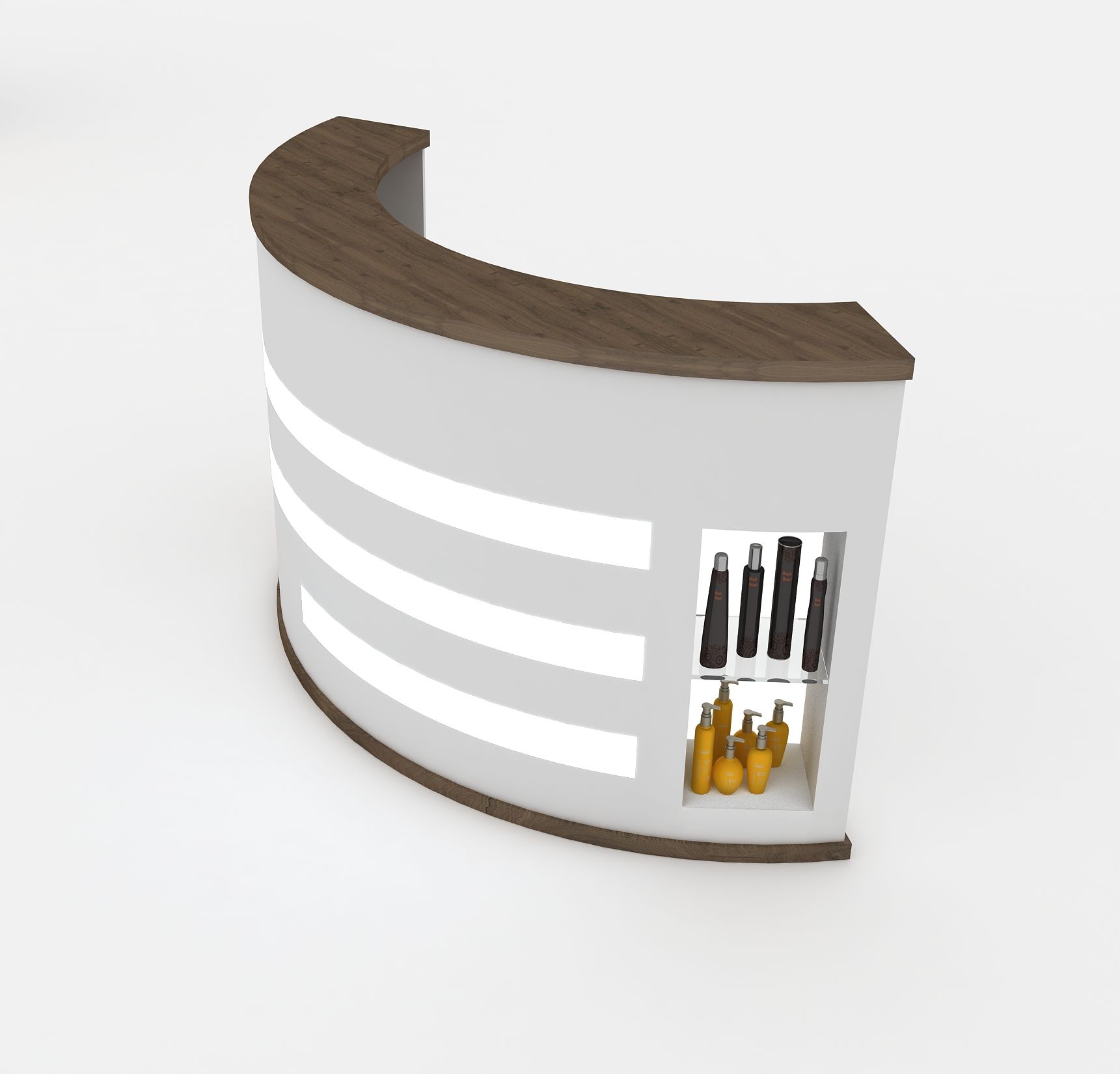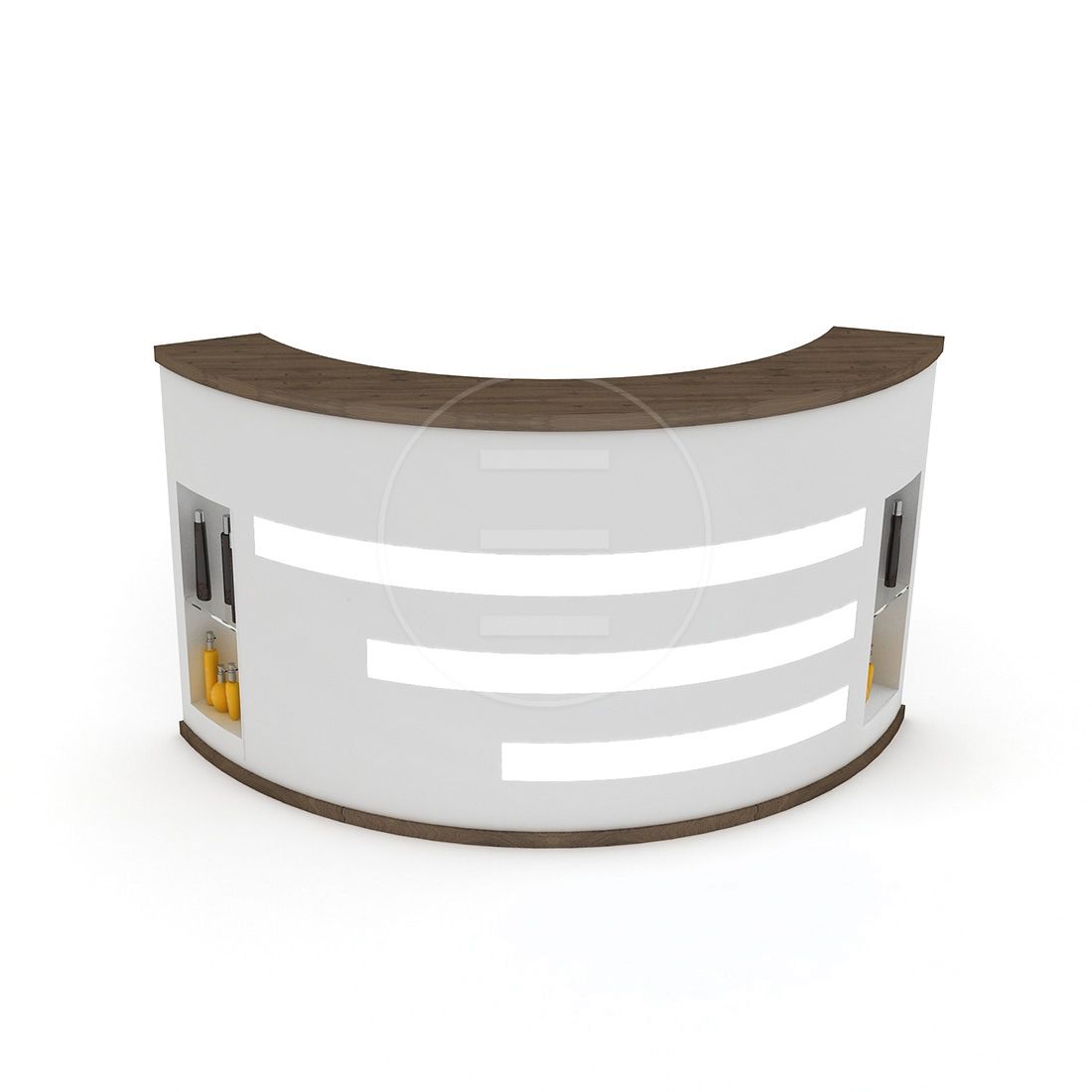 LED belysning och visningshyllor för produkter på sidorna.