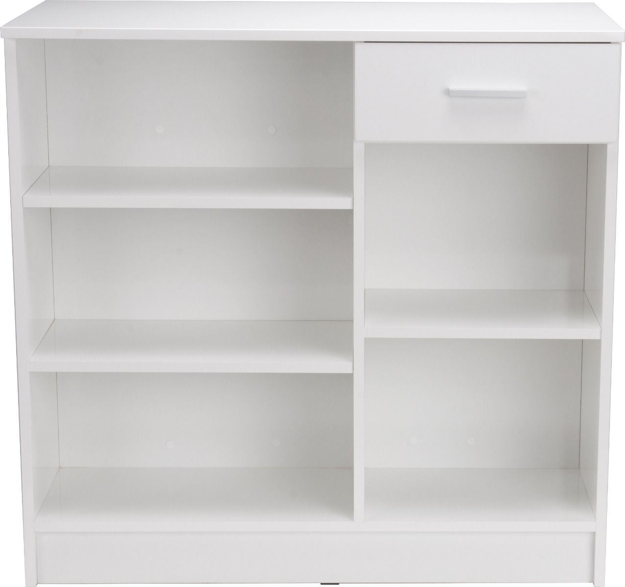 Den är utrustad med flera öppna hyllor och en låda, vilket gör att den kan rymma de nödvändiga sakerna i väntrummet.