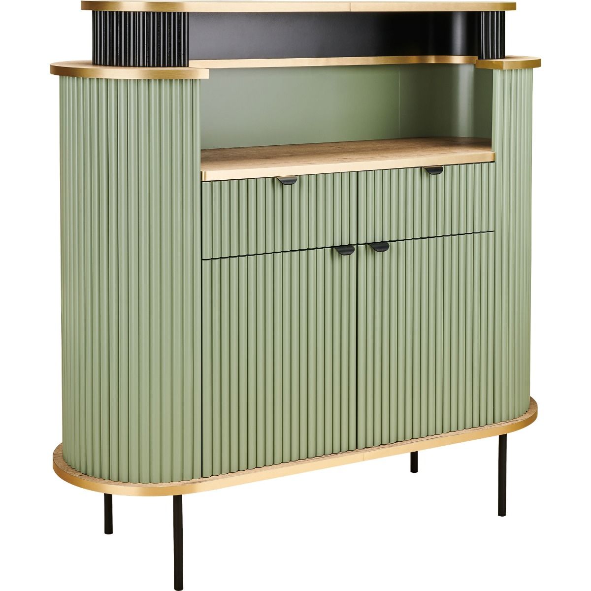 Topparna och basen är gjorda av möbel skiva, och strukturen är tillverkad av fräst, lackerad MDF-skiva i ett lamell mönster. Kombinationen av flera olika strukturer skapar en intressant helhet.