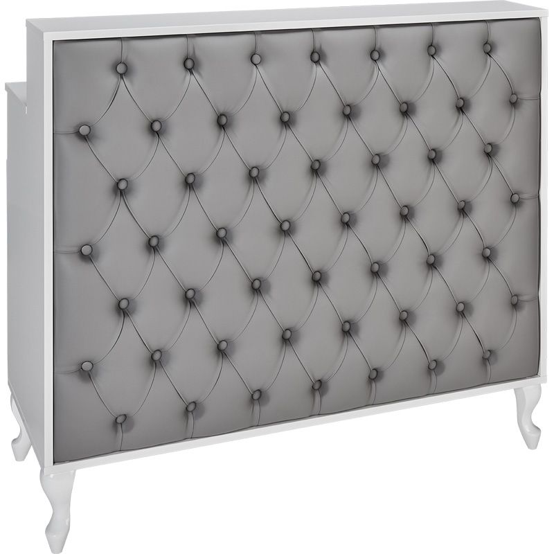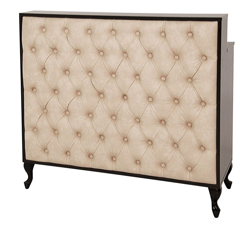 MADAME är en bred receptionsdisk med en klädd, elegant och knappad front. De stiliserade träbenen är tillverkade av naturligt bokträ.