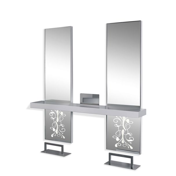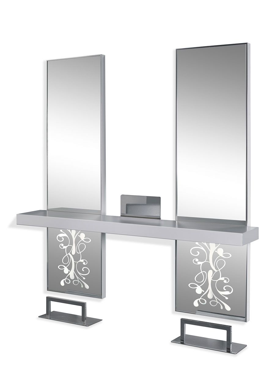 Taklist i aluminium, dekorerad spegel, fotstöd och dekoration i förkromad metall, topp i lackerat trä, med belysning inbyggd.