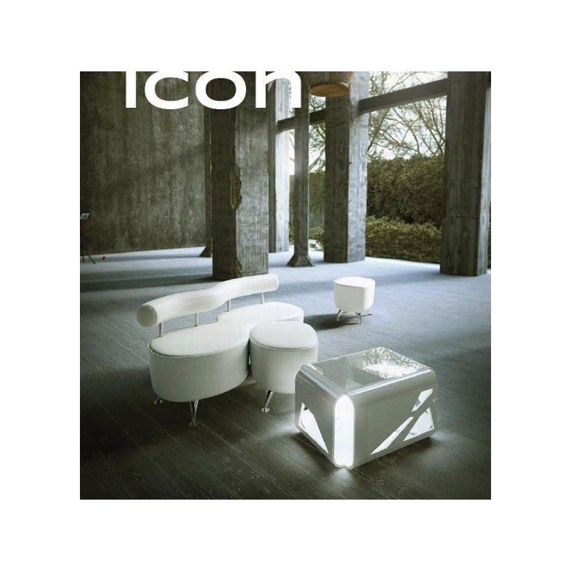 Ett modernt väntbord med belysning på insidan av bordet och glasskiva på toppen.